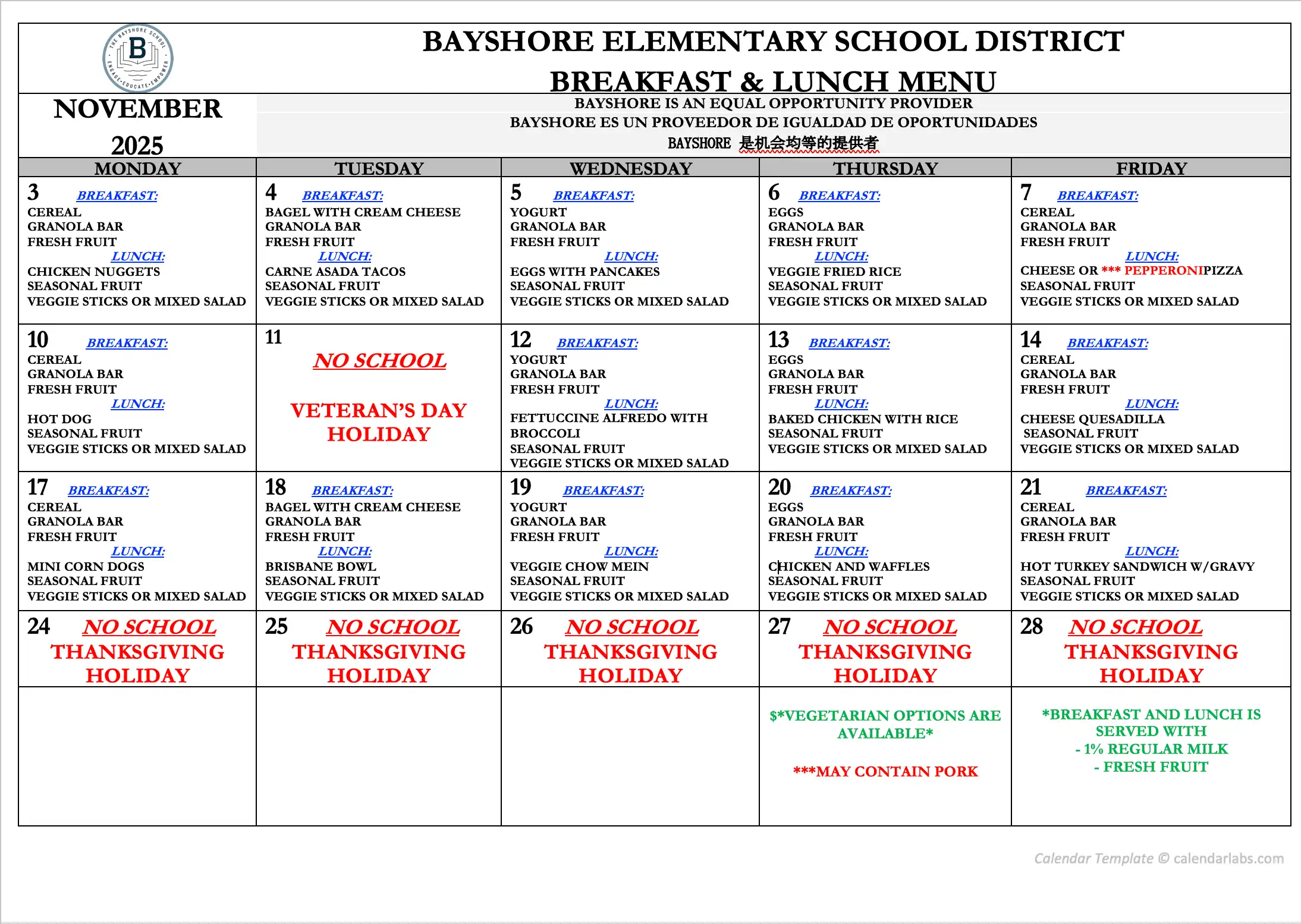 School Menu for NOVEMBER
